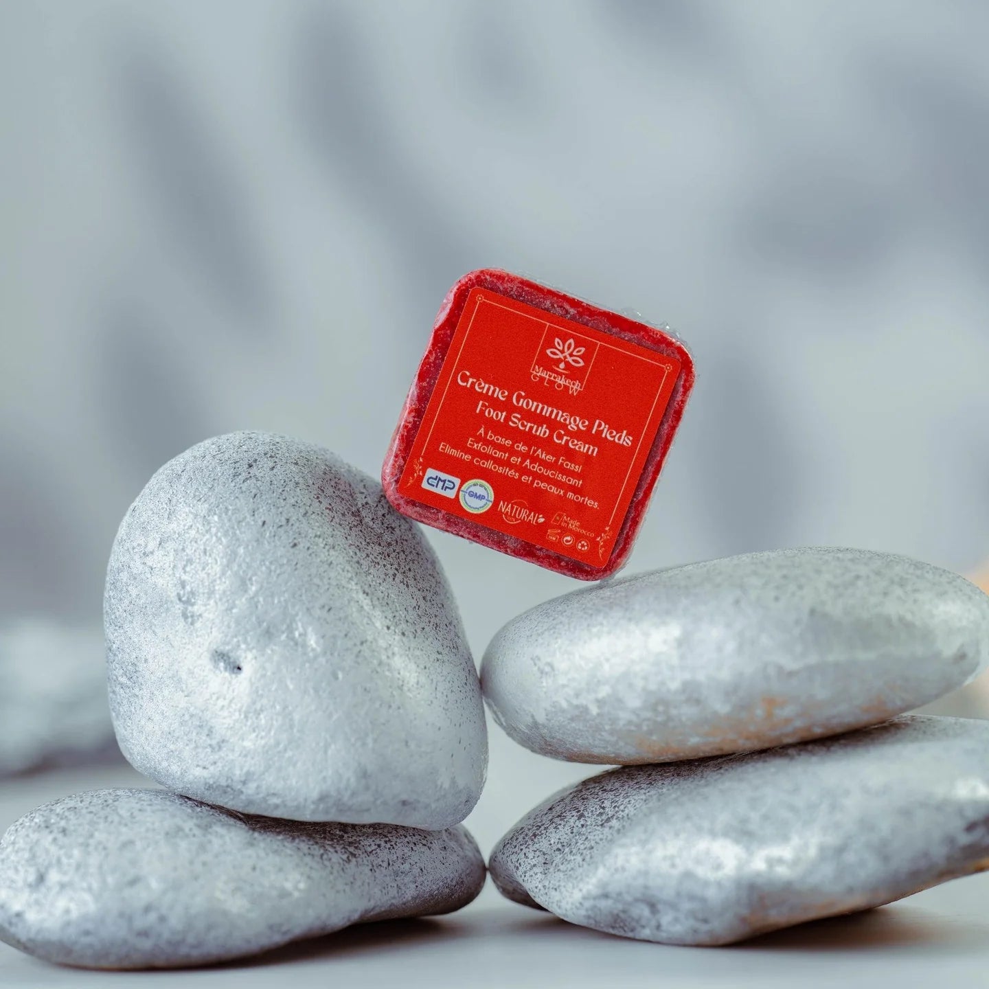 Step into the ancestral beauty secrets of Morocco with this Exfoliating Foot Scrub infused with Aker Fassi (red poppy + pomegranate rind). Known for its brightening and softening powers, Aker Fassi has been cherished by Moroccan women for generations. This solid foot scrub gently removes calluses and rough skin while nourishing with shea butter and natural oils, leaving your feet smooth, revitalized, and beautifully perfumed.